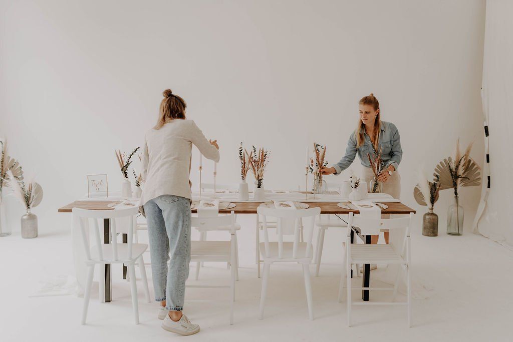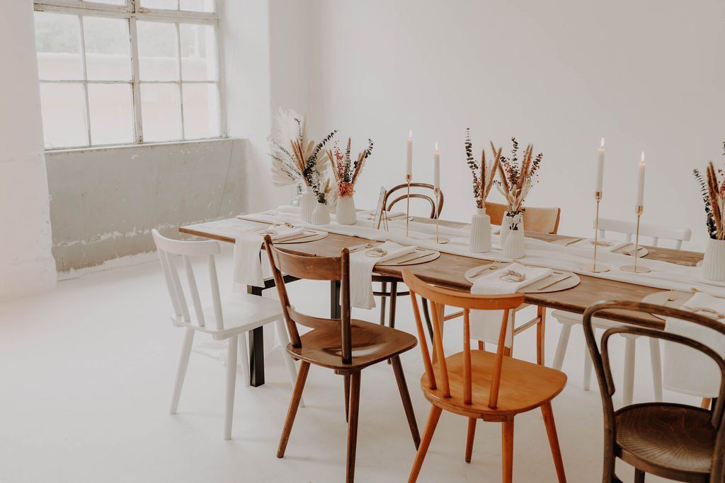 Durch weiße Stühle wirkt die gedeckte Hochzeitstafel bei unserem Shooting clean und elegant. 😍
