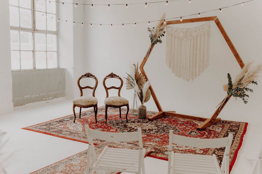 Makramees, Teppiche und Blumenschmuck verleihen den Traubögen beispielsweise den richtigen Boho-Look.
