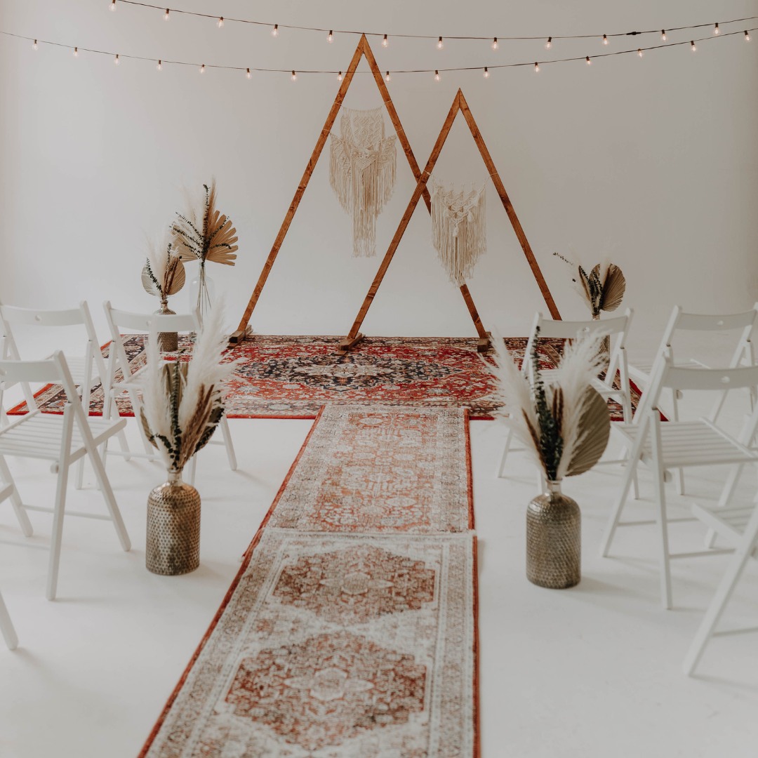 Einen roten Teppich der besonderen Art bieten die Läufer im Boho-Stil. Sie passen wunderbar zu Traubögen mit Trockenblumen und Makramees.